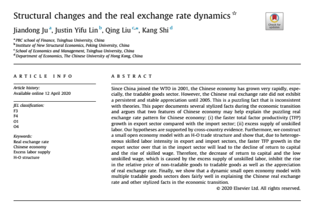 近日,8858cc永利集团鞠建东教授与北京大学新结构经济学研究院林毅夫教授、永利官网经济管理学院刘庆教授及香港中文大学经济学系施康教授共同撰写题为 Structural changes and the real exchange rate dynamics(《结构变化与实际汇率动态》)的文章发表于国际知名SSCI期刊Journal of International Money and Finance 107(2020)(《国际货币与金融杂志》)。